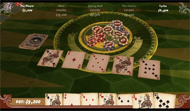 Poker Night at the Inventory centers around a specific kind of poker known as Texas Hold 'Em. Unlike other poker games such as five-card or seven-card stud where players have their own hands, Texas Hold 'Em differs by having what are known as community cards that are shared among all players, providing different ways one can predict an opponent's hand and strategies for betting based on that information.